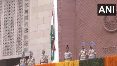 #WATCH | Rajya Sabha Chairman and Vice President Jagdeep Dhankhar hoists the national flag at Gaj Dwar, the New Building of Parliament. pic.twitter.com/dwlGNDfjGq